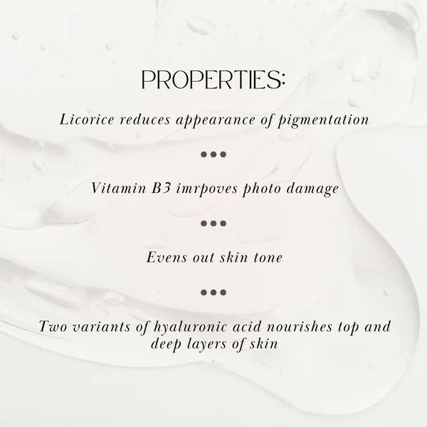 • Licorice Root Extract – Natural skin brightener that reduces pigmentation and inhibits melanin production.