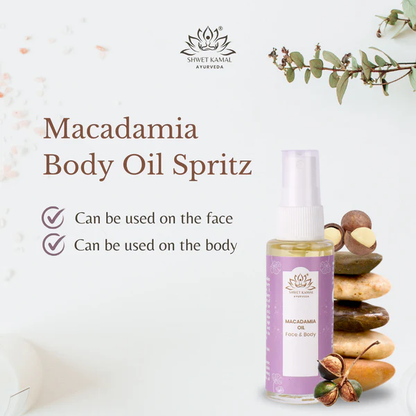 Dehydrated, rough, or aging skin needs extra care that penetrates deeply. The Shwet Kamal Ayurveda Macadamia Oil for Face and Body is a luxurious Ayurvedic solution enriched with palmitoleic acid, Vitamin E, and natural antioxidants that hydrate, heal, and protect skin.