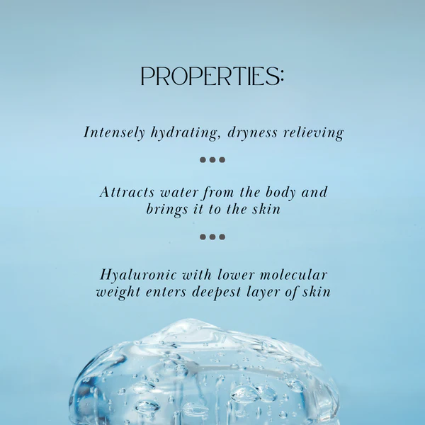 Hyaluronic Acid-LMW (derived from bio-fermented plant-based sources like glucose, soy, or wheat using specific strains of bacteria): Smaller molecules can travel deeper into the skin layers, providing more long-lasting hydration, improve skin elasticity, plumpness and encourages collagen synthesis for improved skin structure.